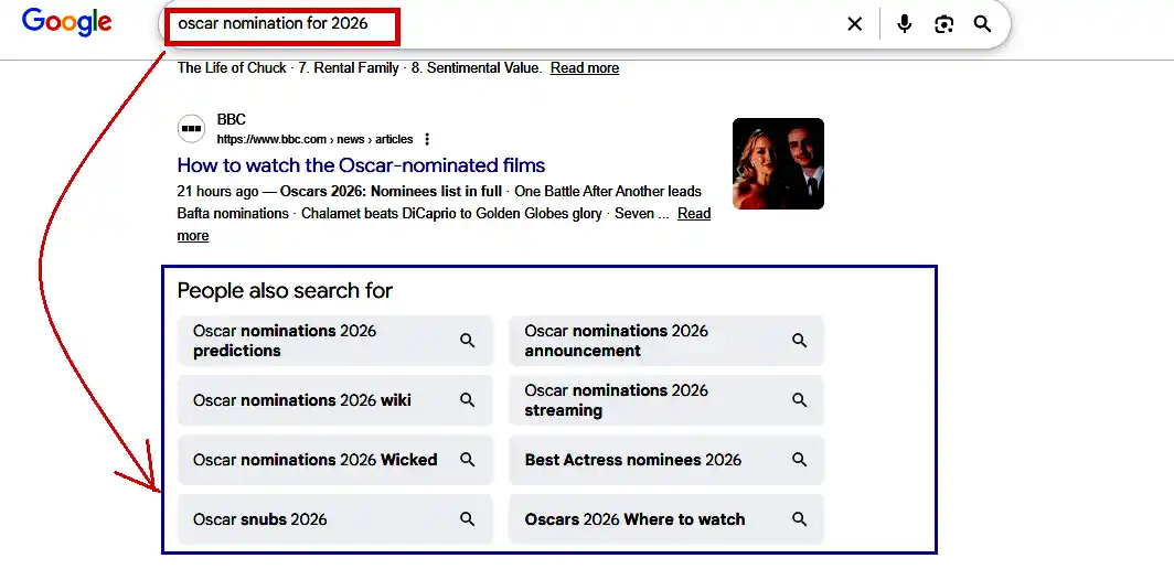 Suppose you search “Oscar nomination for 2026” on Google. This search query can bring 8 new ideas to make a plan for a better framing of the topic cluster. These query helps you to make out painpoint of the user or the information that needs to be addressed. Based on this suggestion, you can add this information of FAQ to never miss out on making optimized content.