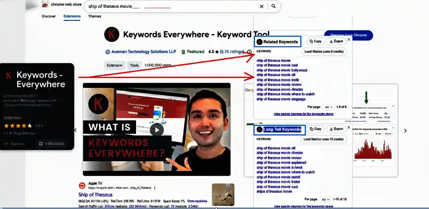 Keywords Everywhere: There is also a Chrome extension, namely Keywords Everywhere, that helps you to go through some extra SERP features for your entered keyword. If you install the Browser extension, you can see something like as seen in the image below. Suppose I want to enquire about the “Ship of Theseus” movie released in 2012. The “Keywords Everywhere” tool shows me information for Related Keywords and Long-Tail Keywords.