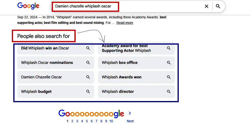 You just enter “Damien Chazelle Whiplash Oscar”. Now, after scrolling, you see the option that shows relevant info according to your search intent. Above all, the PASF feature assisted users in making the user-driven searching process more refined, easier, and seamless.