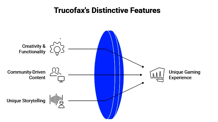 The above diagram shows how creativity, community content, and storytelling combine to create Trucofax’s unique gaming experience