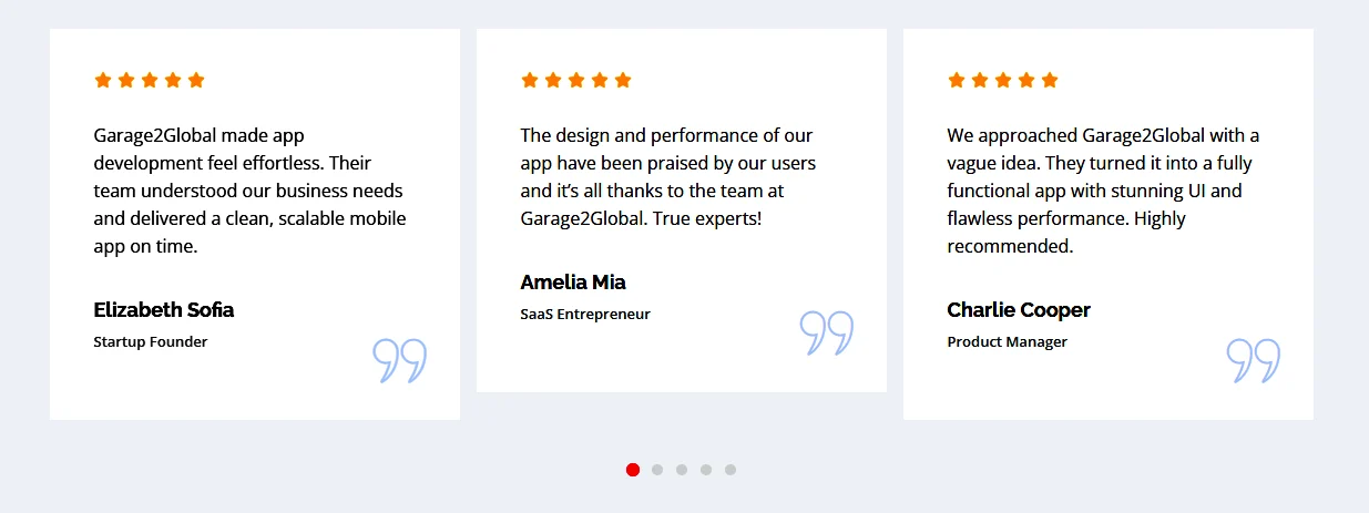 “We approached Garage2Global with a vague idea. They turned it into a fully functional app with stunning UI and flawless performance. Highly recommended.”– Charlie Cooper, Product Manager