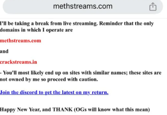 “I’ll be taking a break from livestreaming. Reminder that the only domains in which I operate are methstreams.com  and crackstreams.in. You’ll most likely end up on sites with similar names; these sites are not owned by me, so proceed with caution. Join the Discord to get the latest on my return.  Happy New Year, and Thank (OGs will know what this mean).”
