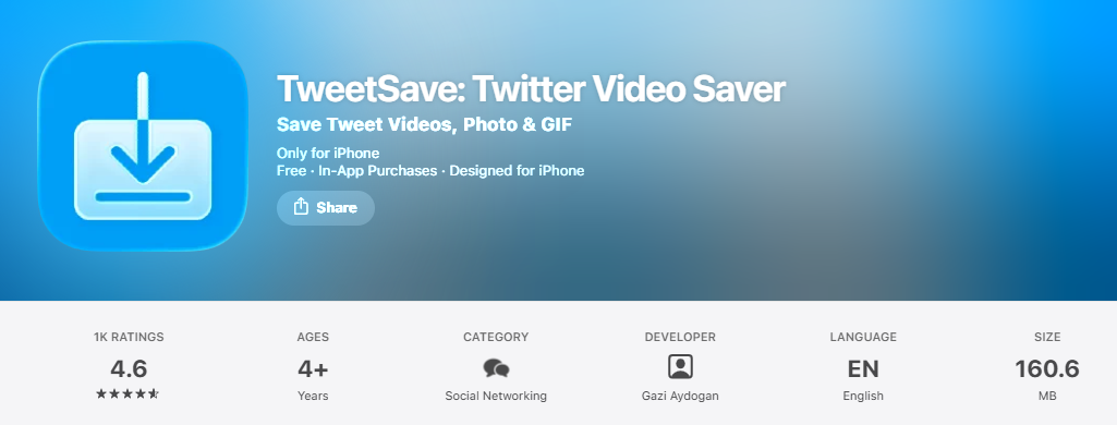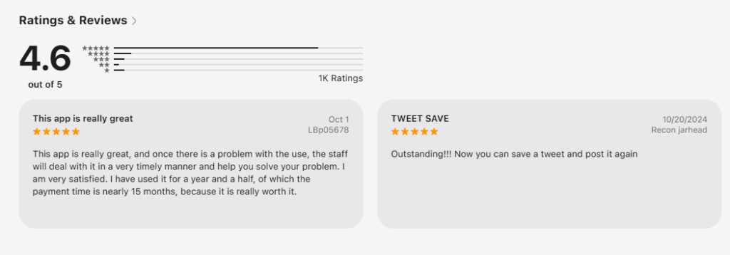 For iPhone users, there is a dedicated app on the App Store called Tweetsave that gives the option for video quality selection and seamless downloading. The app has a 4.6 rating, and users, especially iPhone users, are satisfied with the app. Below, I share the customer reviews for the Tweetsave app.