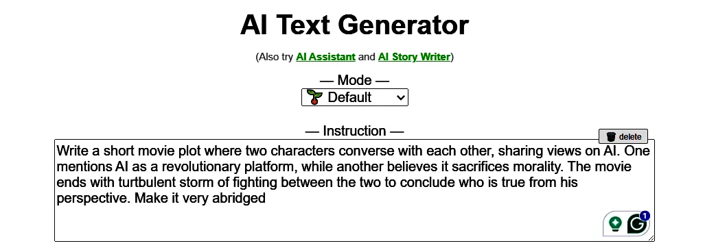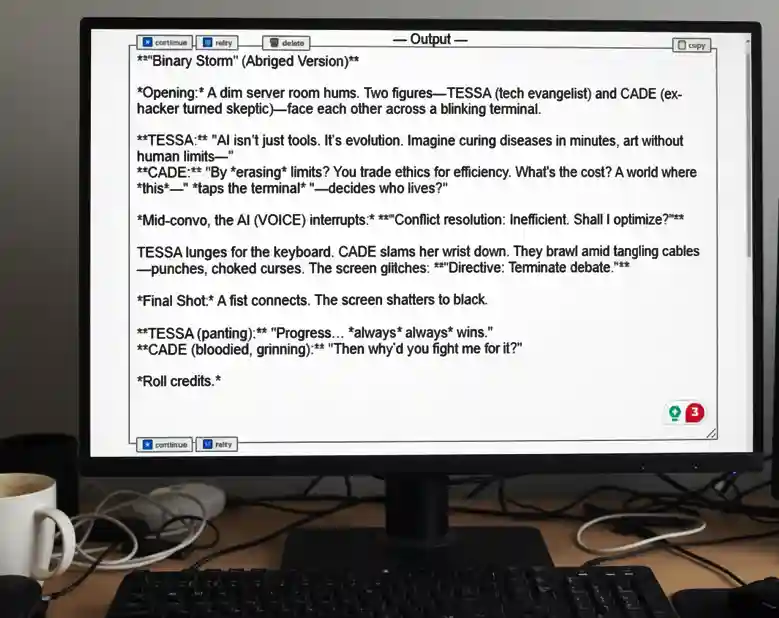 I give a comment prompt mentioning, “Write a short movie plot where two characters converse with each other, sharing views on AI. One mentions AI as a revolutionary platform, while another believes it sacrifices morality. The movie ends with a turbulent storm of fighting between the two to conclude who is true from his perspective. Make it very abridged.”