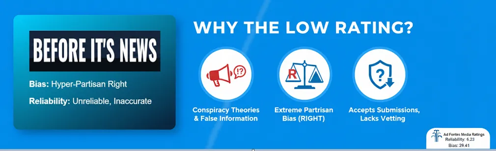 Ad Fontes Media reveals that the site Before Its News has a reliability score of 6.23 out of 64. The rating reflects its role in spreading false information and rumors that cause social and political unrest.