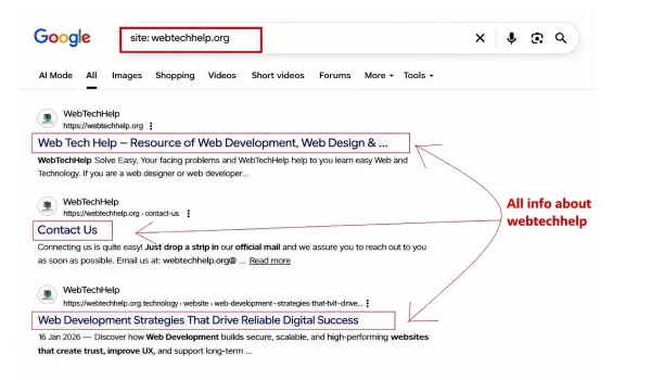 Suppose you want to retrieve information on a particular website by searching for it on Google. You just need to follow the pattern like ‘site: example.com.’ It will show you information for the site only. Suppose I want to go to the website webtechhelp.org. I simply copied the url link and entered the command prompt  “site:webtechhelp.org” to gather information for this one site. Below, I share the screenshot to make it easy to understand for you.